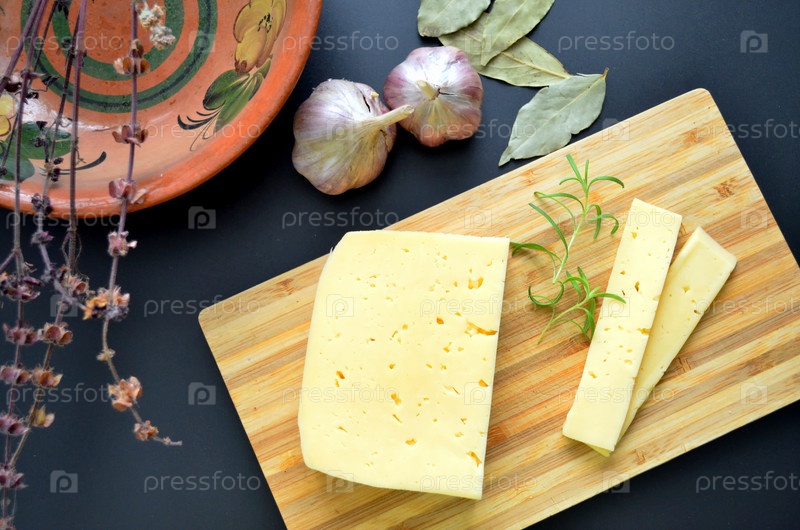 Кусок сыра, веточка розмарина, ломтики нарезанного сыра , чеснок, лавровый лист на темном фоне