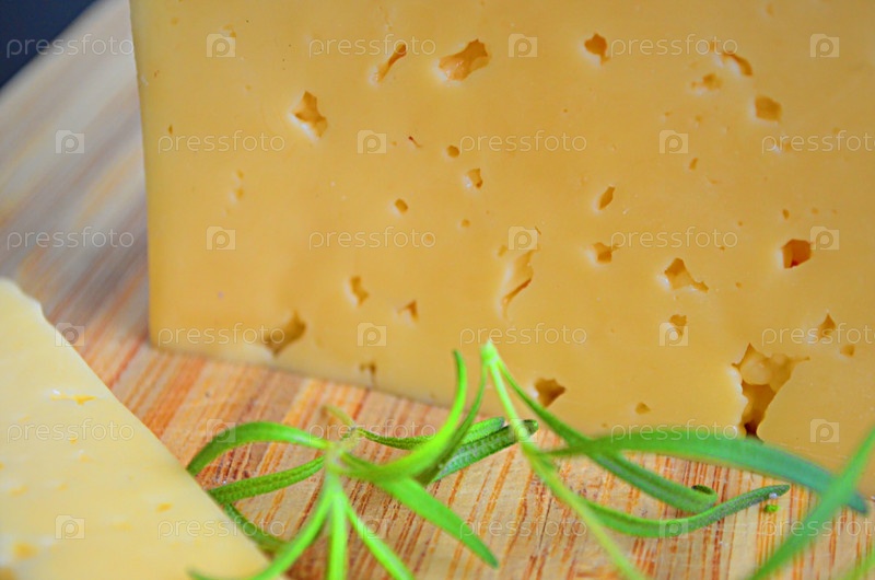 Кусок сыра, веточка розмарина и дырочки на сыре крупным планом