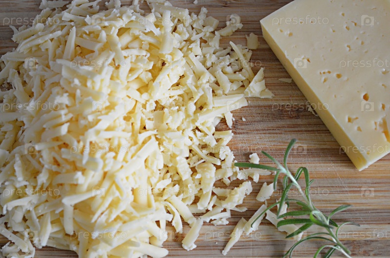 Кусок сыра, веточка розмарина и горка натертого сыра