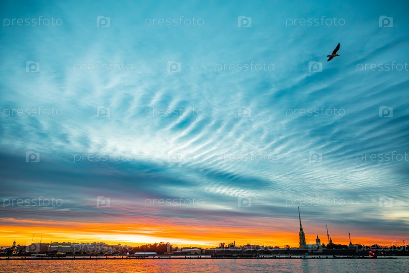 Нева на фоне Петропавловской крепости на закате