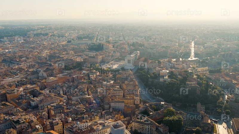 Рим, Италия.Виториано - памятник первому королю Италии Виктору Эммануилу II.Полет над городом.Панорама города утром.Задняя подсветка.Летом Aerial View