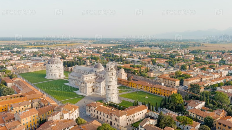 Пиза, Италия. Знаменитая Пизанская башня и Пизанский собор на площади Чудес. Лето. Утренние часы, вид сверху