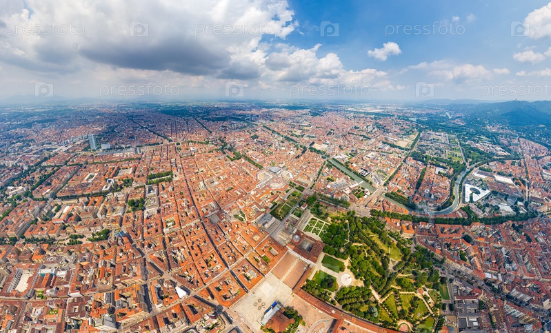 Палаццо Мадама, Королевский дворец в Турине. Королевские сады. Замковая площадь (Piazza Castello). Панорама центральной части города. Вид с воздуха