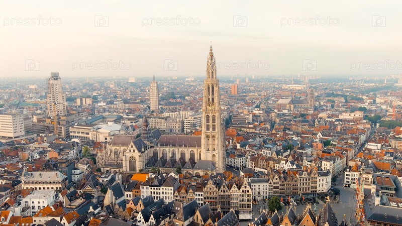 Антверпен, Бельгия. шпиль с часами собора Богоматери (Антверпен). Исторический центр Антверпена. Город расположен на реке Шелде (Эскаут). Летнее утро, Aerial View