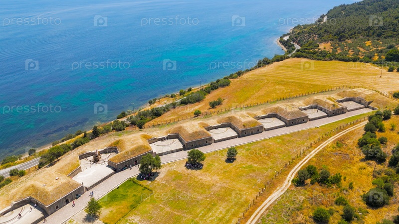 Близкий взгляд с воздуха на каменные стены и архитектурные детали бастиона Мечидия, выходящие на Дарданеллы