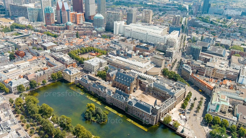 Гаага, Нидерланды. Binnenhof. Озеро Хофвиджвер в историческом центре города. Облачная погода. Летний день, Aerial View