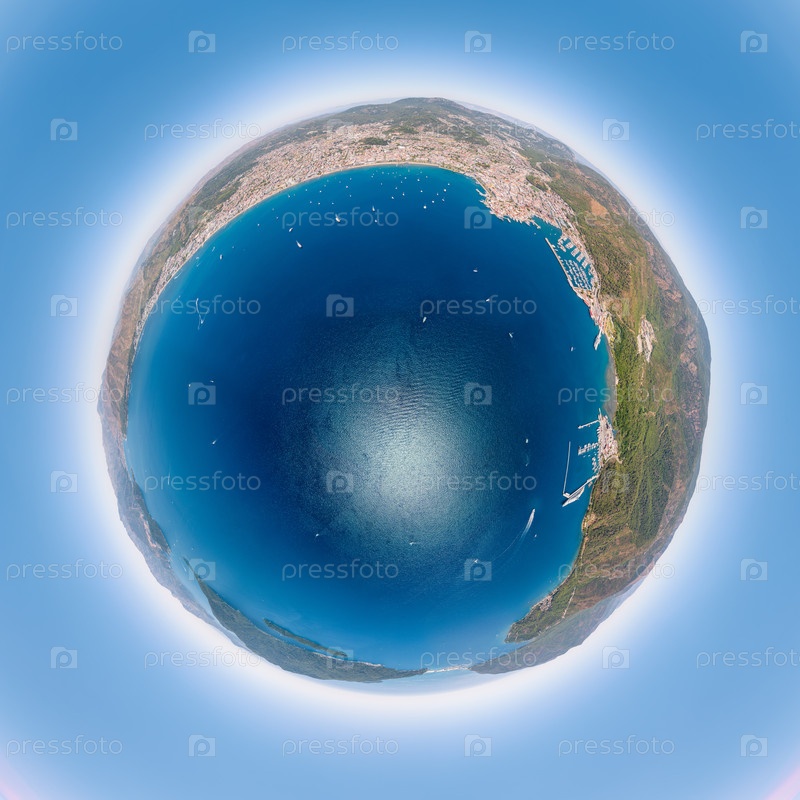 Мармарис, Турция. 360-градусный панорамный взгляд с астероида из воздуха на залив с помощью яхт и береговой линии в дневное время. Маленькая перспектива планеты турецкого побережья. 360-градусный аэропанорамный астероид