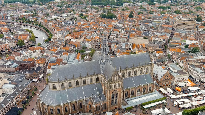 Церковь Святого Баво - готический храм Панорамный вид на центр города Гарлема Облачная погода в течение дня Лето, аэрофотосъемка