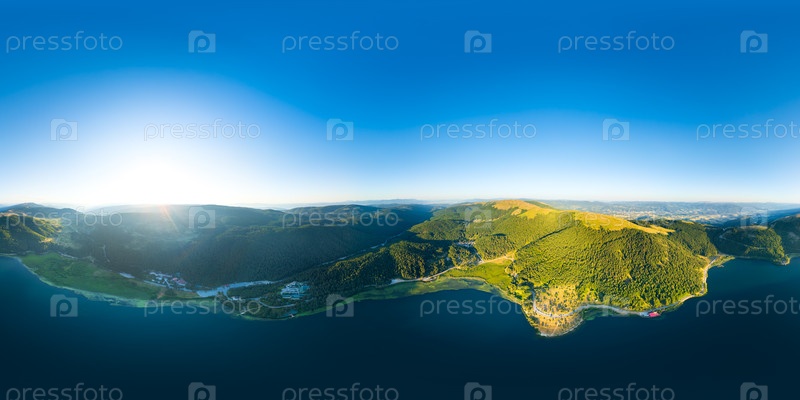 Абант - большое пресноводное озеро, окруженное горами и лесом с живописным видом. время захода солнца. панорама 360 x 180. вид из воздуха