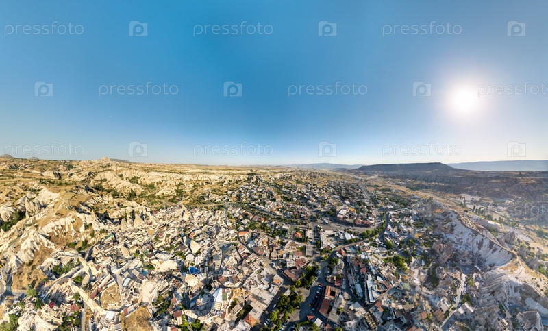 Широкий панорамный вид с воздуха на центр города Гореме со своим смесью современных структур и древних пещерных домов, окруженные зеленью и вулканической местностью
