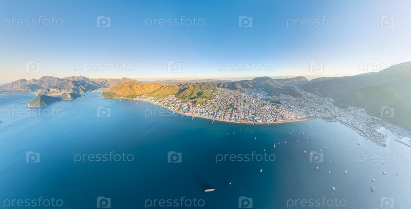 Панорамный вид из воздуха на центр города, береговую линию с пляжами, пристань и яхты в заливе с горами позади