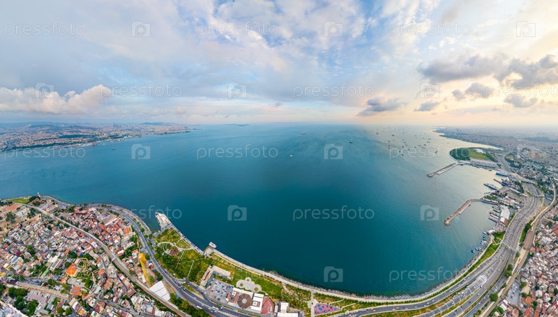 Стамбул, Турция. Историческая набережная полуострова. Морская пробка в Босфорском проливе. Район Фатих под мрачными закатными облаками. Вид с воздуха