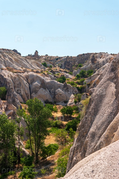 Горэме, Невшехир, Турция. эрозированные скальные образования с резкими ярко-цветными породами, пересеченной зеленью, деревьями и кустарниками в середине земли, большие образования на заднем плане под чистым голубым дневным небом