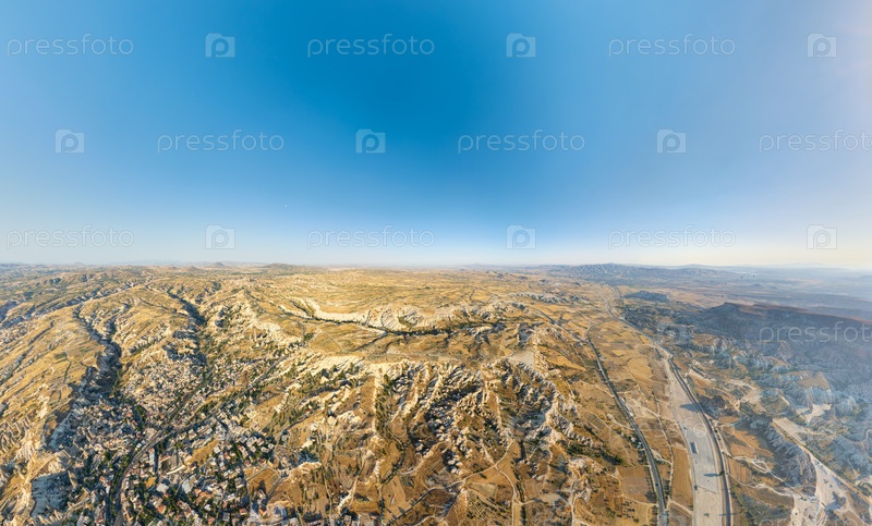Широкий панорамный вид с воздуха на город Гореме и окружающие его эродированные долины, высеченные в вулканическом плато под солнечным утренним светом