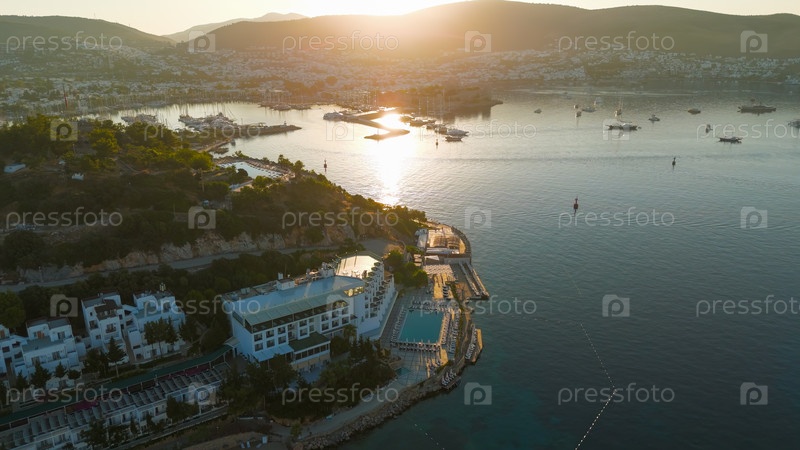 Бодрум, Турция. вид с воздушных дронов на побережье залива Гокова с многочисленными яхтами и бирюзовой водой. живописный морской пейзаж турецкой Ривьеры.. Aerial View