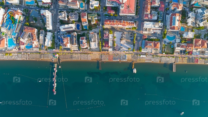 Мармарис, Турция.Прибрежный городской ландшафт с пиром, спокойной водой, улицами и отелями сверху.Пляжи со рядами подсолнухов и утренней атмосферой..Воздушное видение