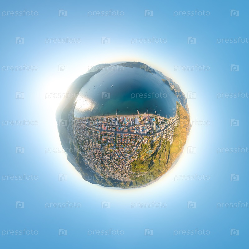 Астероид крошечная планета панорама городского побережья утром 360-градусный сферический взгляд из воздуха на город, залив, пляжи и отели