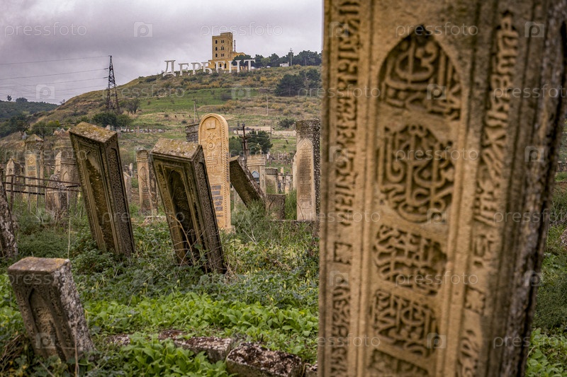 Старое Мусульманское кладбище Кырхляр на фоне надписи Дербент. Дагестан