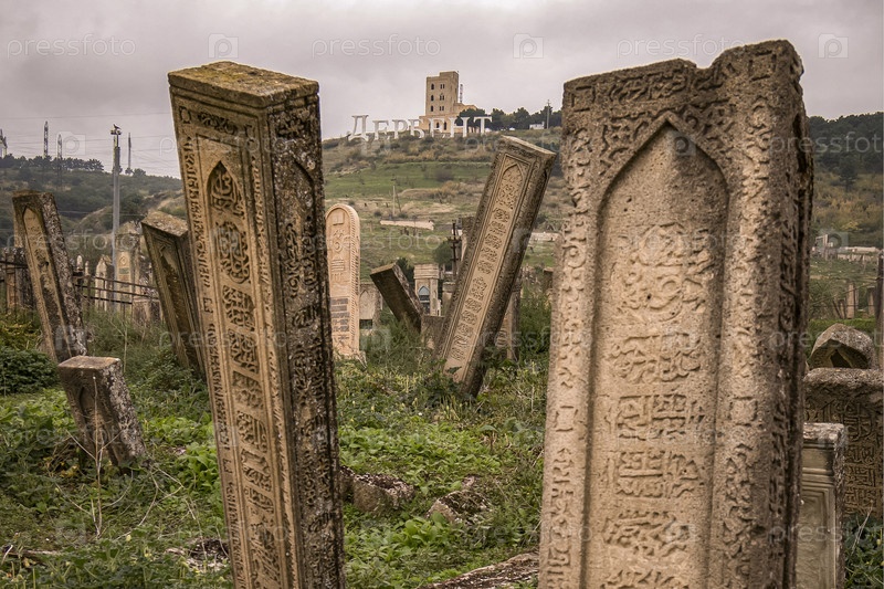 Старое Мусульманское кладбище Кырхляр на фоне надписи Дербент. Дагестан