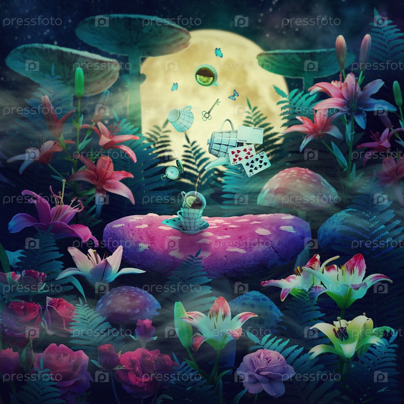 Фантастический ландшафт леса страны чудес с грибами и цветами. сумасшедшая чайная вечеринка. иллюстрация