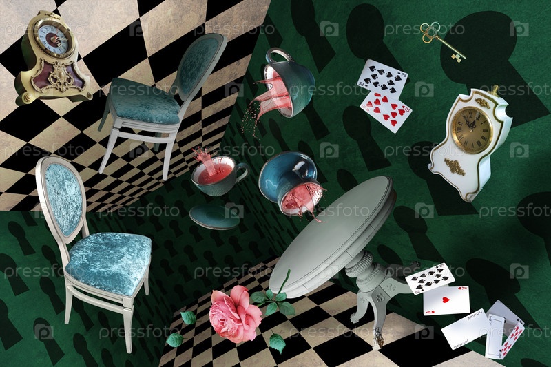 Комната мира чудес.Летающая мебель, игровые карты, чаши, часы, ключи и многое другое на фоне зеленых стен и шахматного пола. Безумная чайная вечеринка. Красочный фон для фотосессий и вечеринок