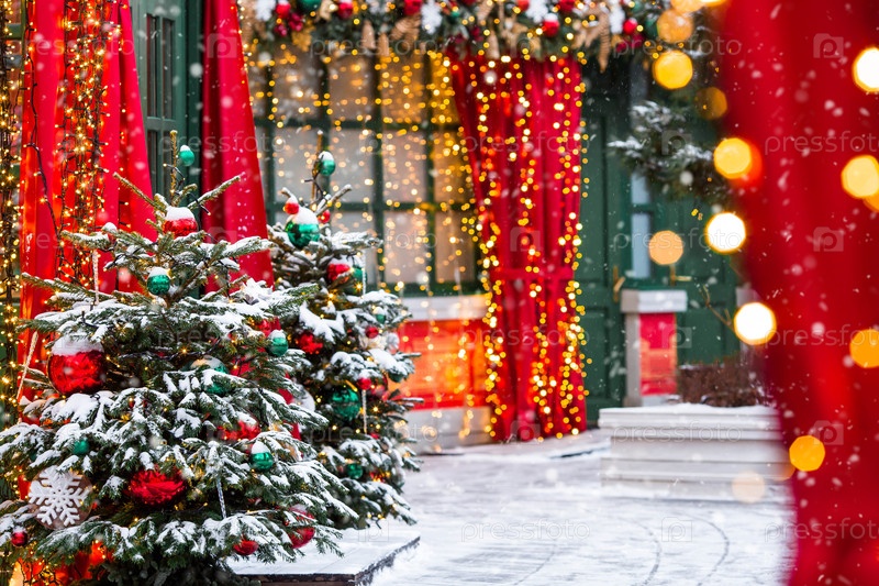 Красивый рождественский фон.Концепция украшений и декораций на новый год 2027.Рождественская елка с красными и золотыми орнаментами в снегу