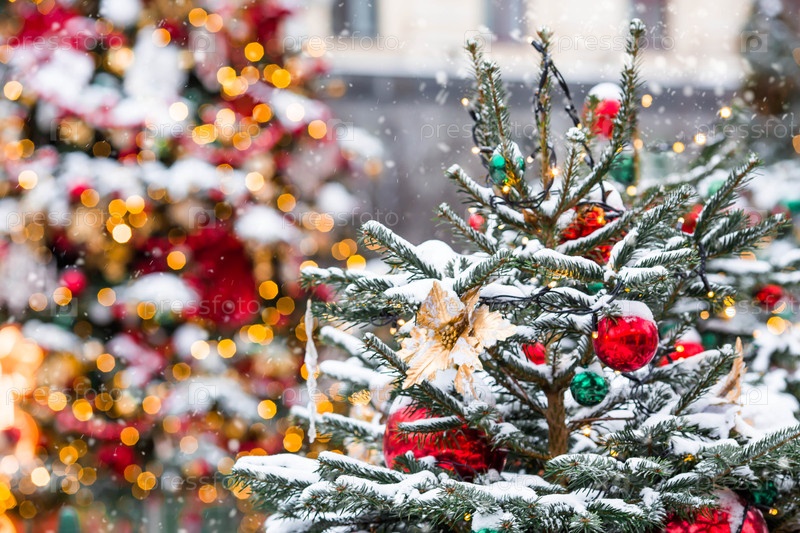 Красивый рождественский фон.Концепция украшений и декораций на новый год 2027.Рождественская елка с красными и золотыми орнаментами в снегу