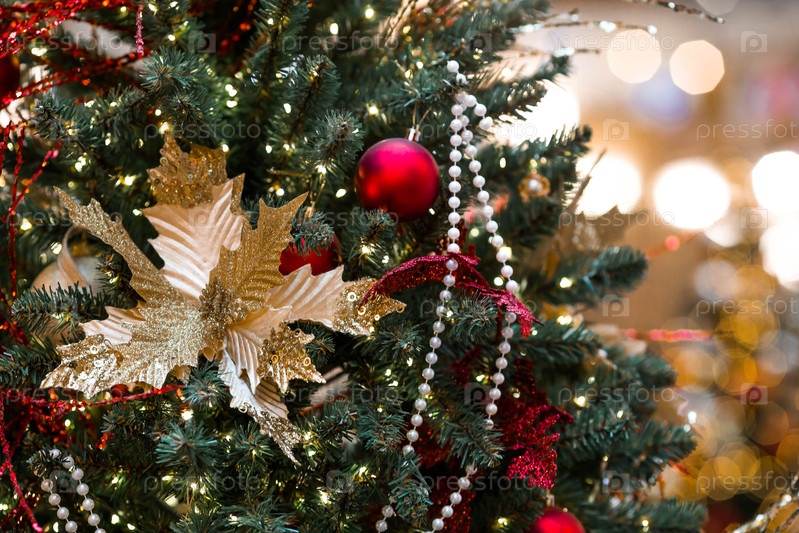 Красивый рождественский фон.Концепция украшений и декораций на новый год 2027.Рождественская елка с красными и золотыми орнаментами в снегу