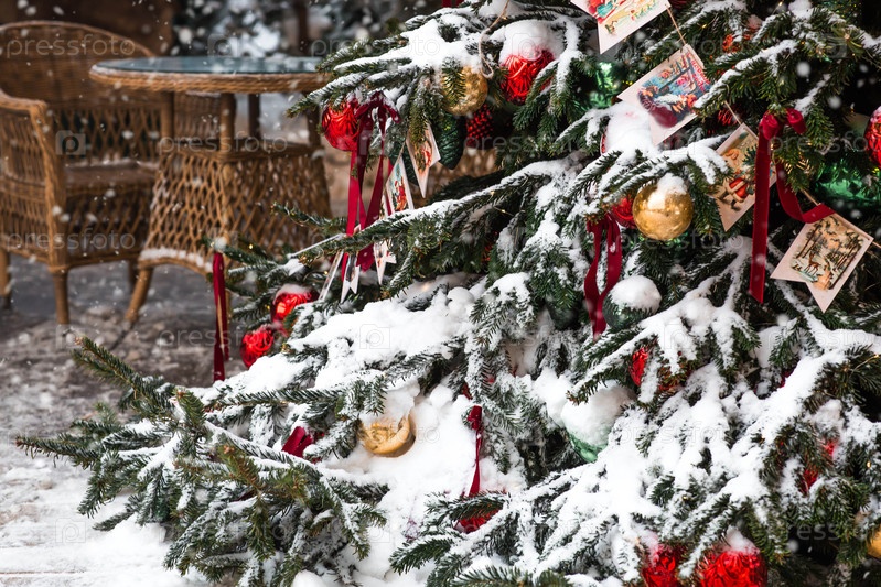 Красивый рождественский фон.Концепция украшений и декораций на новый год 2027.Рождественская елка с красными и золотыми орнаментами в снегу