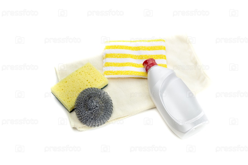 Новые полотенца, тряпки и моющие средства на белом фоне вблизи