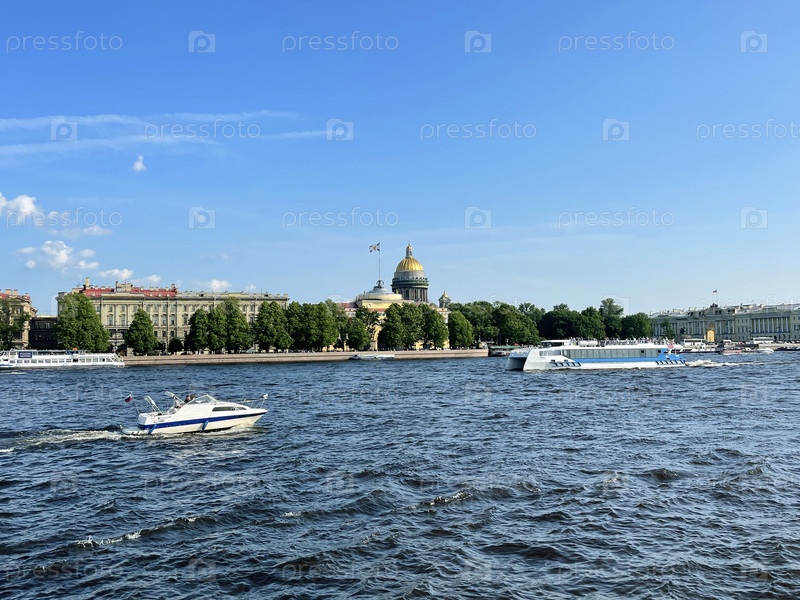 Вид на собор Святого Исаака и Адмиралтейство с реки Невы в солнечный день, Санкт-Петербург, Россия