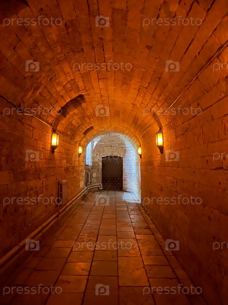 Подземная подвальная комната с изогнутым арочным потолком, освещенной изнутри.Перспективный вид ведет к яркому свету в конце коридора