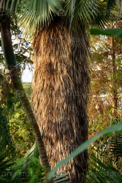 Крупный план ствола веерной пальмы, покрытого сухой волокнистой «юбкой» из отмерших листьев, на фоне зеленой тропической растительности и мягкого естественного света