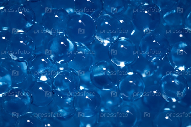 Макросъемка прозрачных синих шариков гидрогеля, заполняющих весь кадр, блики и отражения света создают глянцевый мокрый эффект