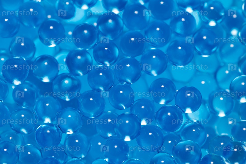 Макросъемка прозрачных синих шариков гидрогеля, заполняющих весь кадр, блики и отражения света создают глянцевый мокрый эффект