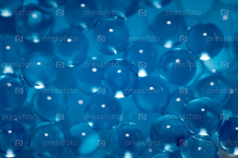 Макросъемка прозрачных синих шариков гидрогеля, заполняющих весь кадр, блики и отражения света создают глянцевый мокрый эффект