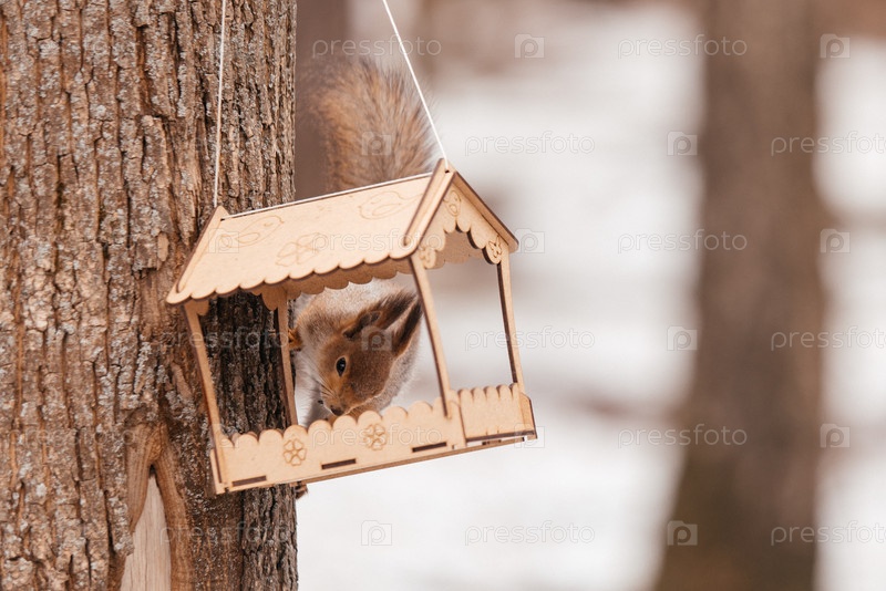 Любопытная белка в деревянном домике: зимний гастрономический осмотр