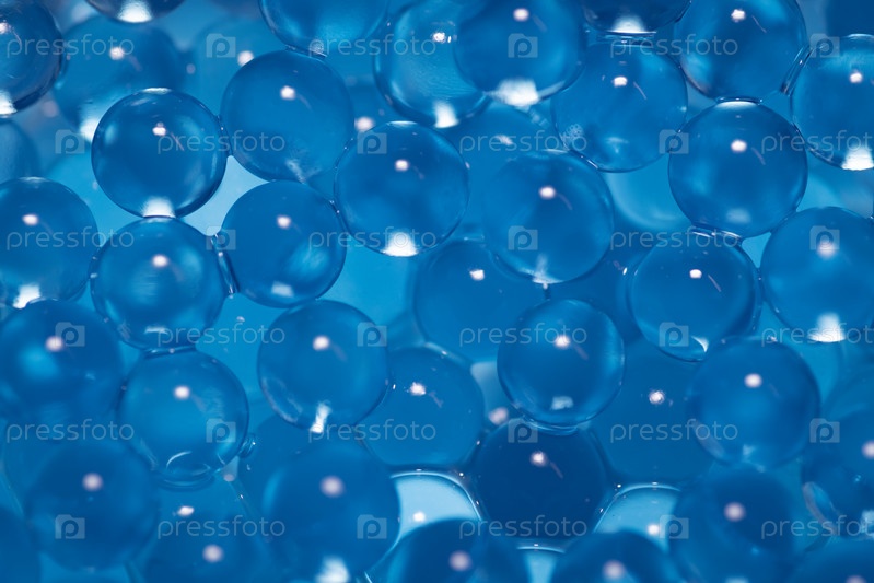 Макросъемка прозрачных синих шариков гидрогеля, заполняющих весь кадр, блики и отражения света создают глянцевый мокрый эффект