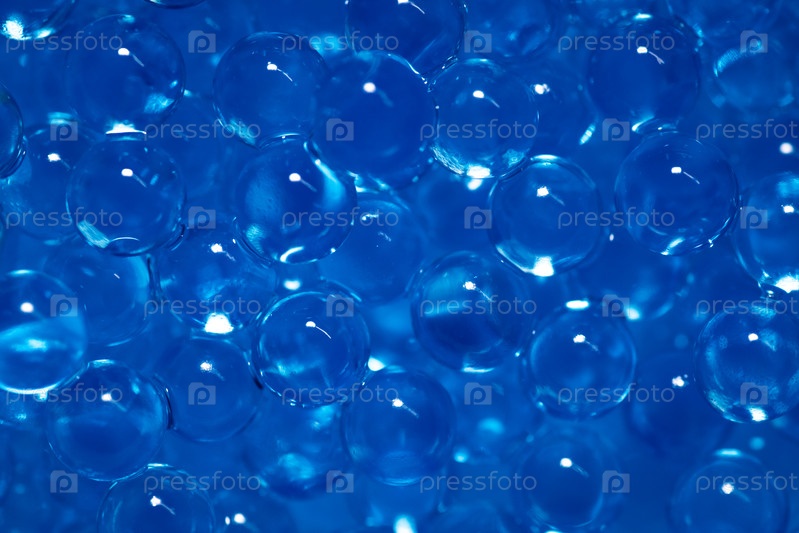 Макросъемка прозрачных синих шариков гидрогеля, заполняющих весь кадр, блики и отражения света создают глянцевый мокрый эффект