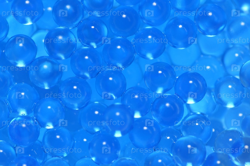 Макросъемка прозрачных синих шариков гидрогеля, заполняющих весь кадр, блики и отражения света создают глянцевый мокрый эффект