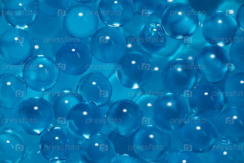 Макросъемка прозрачных синих шариков гидрогеля, заполняющих весь кадр, блики и отражения света создают глянцевый мокрый эффект