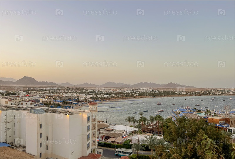 Закат солнца над домами в Шарм-эль-Шейхе в апреле, Египет