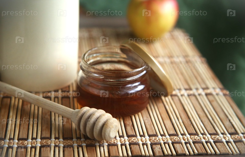 Стеклянная банка меда и деревянная мешалка на бамбуковом коврике, крупный план