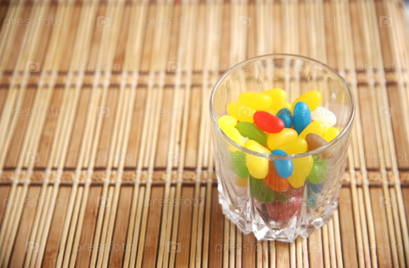 Разноцветные конфеты драже на столе в бокале, крупный план