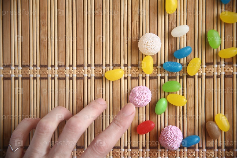 Разноцветные конфеты драже и рука человека на столе, крупный план