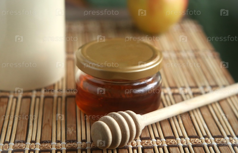 Стеклянная банка меда и деревянная мешалка на бамбуковом коврике, крупный план