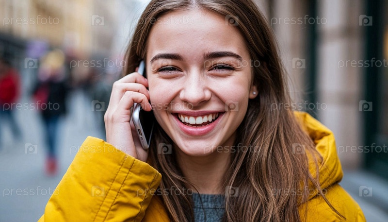 Девушка разговаривает по телефону и смеется. Красивая молодая женщина разговаривает по телефону. Девушка смеется разговаривая по телефону