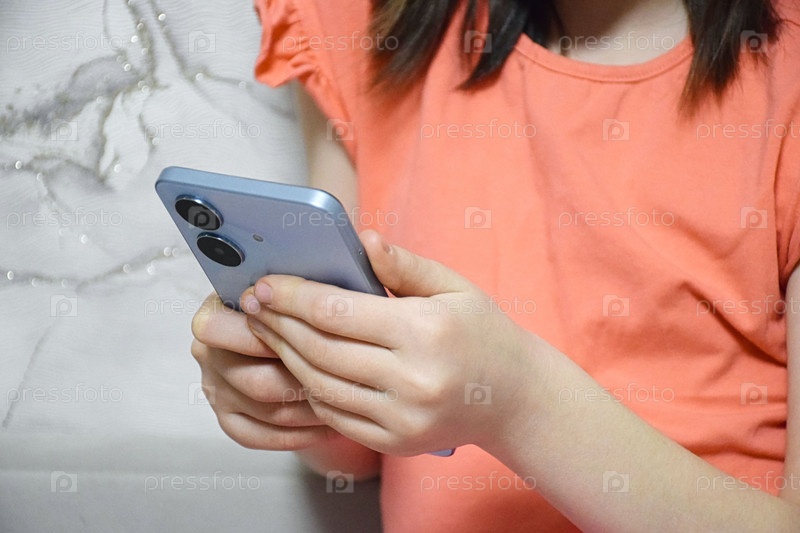 Девочка подросток смотрит в телефон, сидит на диване. Девочка сидит на диване и смотрит видео на телефоне, играет в игры, ведет свою страницу в интернете, общается по видео с друзьями