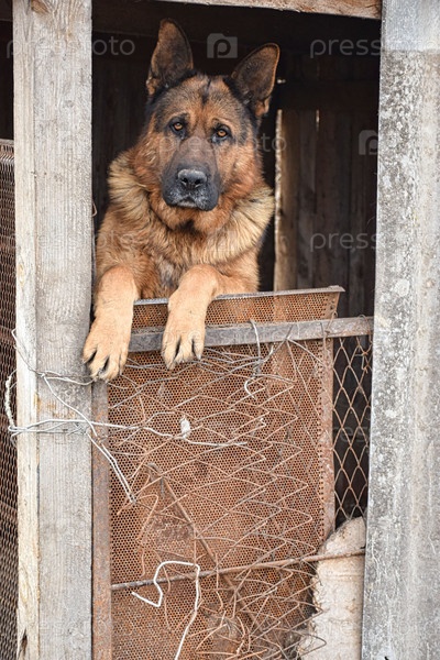 Немецкая овчарка в деревянной будке сторожит участок