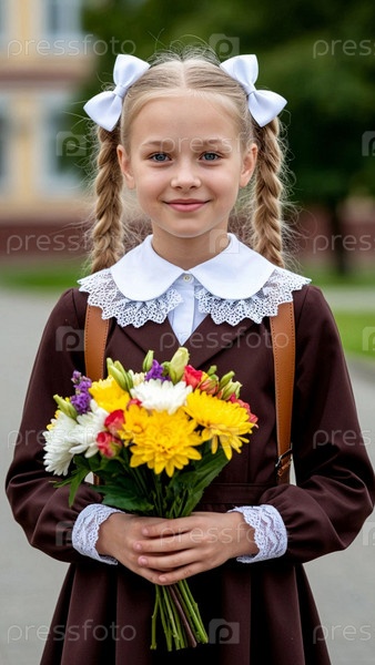 Школьница в школьной форме с белыми фартуками и бантами. Ученица на 1 сентября в парадной школьной форме с букетом цветов